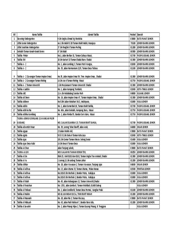 Single Storey Cluster House Title type. Sebelum ini kawasan ini dinamakan Johor Barat. Bandar Tenggara 20 Batu Anam 63 Batu Pahat 318 Bekok 23 Benut 122 Bukit Gambir 57 Bukit Pasir 54 Chaah 27 Endau 43 Gelang Patah 36 Gerisek 56 Gugusan Taib Andak 8 Iskandar Puteri 79 Jementah 76 Johor Bahru 2228 Kahang 38 Kluang 405 Kota Tinggi 175 Kukup 75 Kulai 125 Labis 77 Layang-Layang 30 Masai 66.